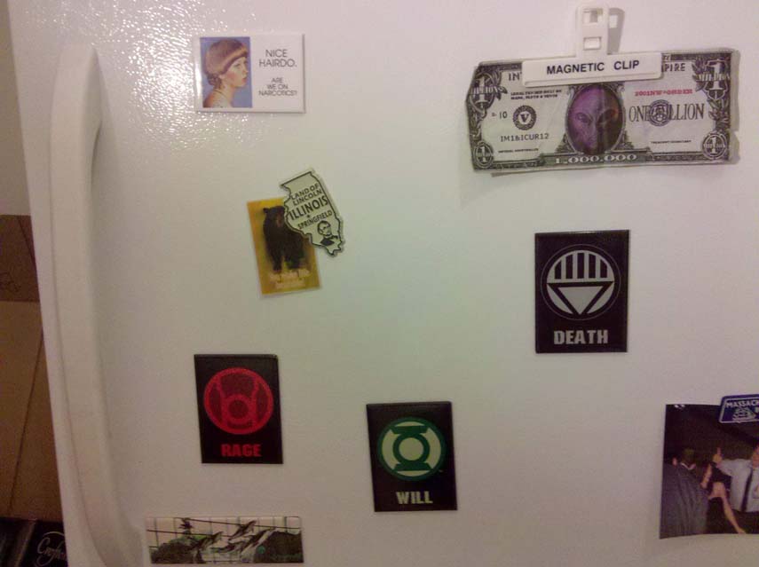 Here’s what’s on my refrigerator. You can see a valentine with a picture of a bear and some sort of pun involving bears. Also, you can see a bill that is worth one million moons. It was given to me by a gentleman in Roswell, NM, after I purchased a crappy t-shirt. He told me I should keep it handy in case I needed to buy my way out of alien slavery. How bad-ass are those magnets though? I actually haven’t been reading the DC Comics event Blackest Knight, but I have been keeping update online with what’s happening. I really only wanted to have a magnet that said “RAGE”, but “DEATH” was so cool I had to get it, and then I bought a third because three is better than two…always.