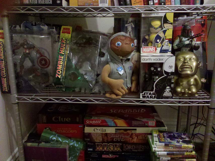 Here are some of my toys. Highlights for me include the set of Zombie Colonel America, Zombie Hulk, and Zombie Spider-Man, as well as the fertility idol from the opening of Raiders of the Lost Ark. The idol also doubles as a bank, which maybe someone relates to fertility? Either way, consider me empty!