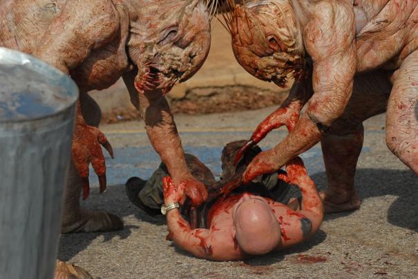 The trebuchet was designed for the wrestler midgets, but to test the weight, they decide to use their grandmother, whose skin has been disintegrating after getting pissed and shit on. They slowly pull body parts off of her until she is the appropriate weight. She successfully makes it to another roof, but when they test the first wrestler, he falls short (heh, short) and gets torn up. At another point, one character hears a baby, and attempts to rescue it. He finds the baby, starts running, but once the monsters see him and start chasing him, he decides that the baby isn’t really that important so he tosses it over his shoulder to distract them. He makes it back to the roof, but as the monsters finally make it to the roof, the credits abruptly roll as we assume everyone is done for.