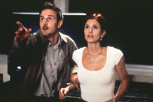 The events of the first film have been turned into a film within a film, called “Stab”. In the opening ten minutes, we see Omar Epps and Jada Pinkett Smith attending the premiere of this movie, only to get killed by someone in costume, without anybody noticing. We then see that Sidney Prescott is now attending college, along with Jamie Kennedy‘s character, and hearing of the murders, Deputy Dewey (David Arquette) investigates Sidney, along with Gale Weathers, which is the name of Courtney Cox‘s character that I didn’t mention in the last review. We also get introduced to a bunch of new characters, believe it or not, because it’s really just those four who return from the first. I guess technically the guy who was falsely accused of killing Sidney’s mother, Cotton Weary, is in this one, and he’s once again played by Liev Schreiber. Someone is starting to recreate murders from the first one, and we don’t know who to blame! Oh no!