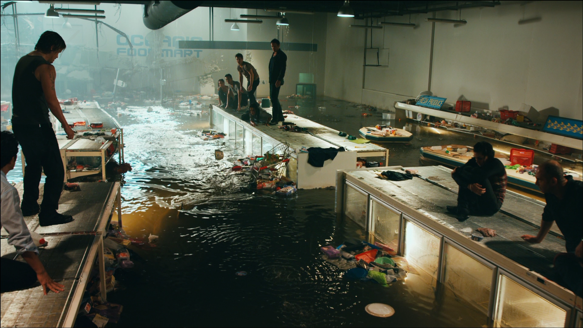 Off the coast of Australia, a man is killed by a great white shark despite his best friend Josh’s (Xavier Samuel) best attempts to save him. A year later, Josh now works in a supermarket and is still dealing with the depression of not being able to save his best friend. While on his way in to work one day, Josh notices strange behavior from animals, which serves as a precursor to the earthquake and tsunami that ends up flooding the supermarket. Trapped in the supermarket is your typical hodgepodge of different characters, from Josh’s ex-fiance to a guy who attempted to rob the place to girl and her cop father, and of course the manager of the store who isn’t keen on taking risks. There’s also a few people trapped in the flooded parking garage, and both the parking garage and supermarket have a great white shark swimming around in them! All these characters attempt to get out of where they’re stuck in all manner of escape, but most of them end up being eaten by one of the two sharks. Eventually Josh is able to get to the car of the policeman, get some weapons, and team up with the attempted robber to not only kill the two sharks, but blow a hole in the debris long enough for everyone to escape. Once back on dry land, all these characters realize there probably wouldn’t have been a rescue team ready to save them, as the entire coast has now been destroyed by the tsunami.