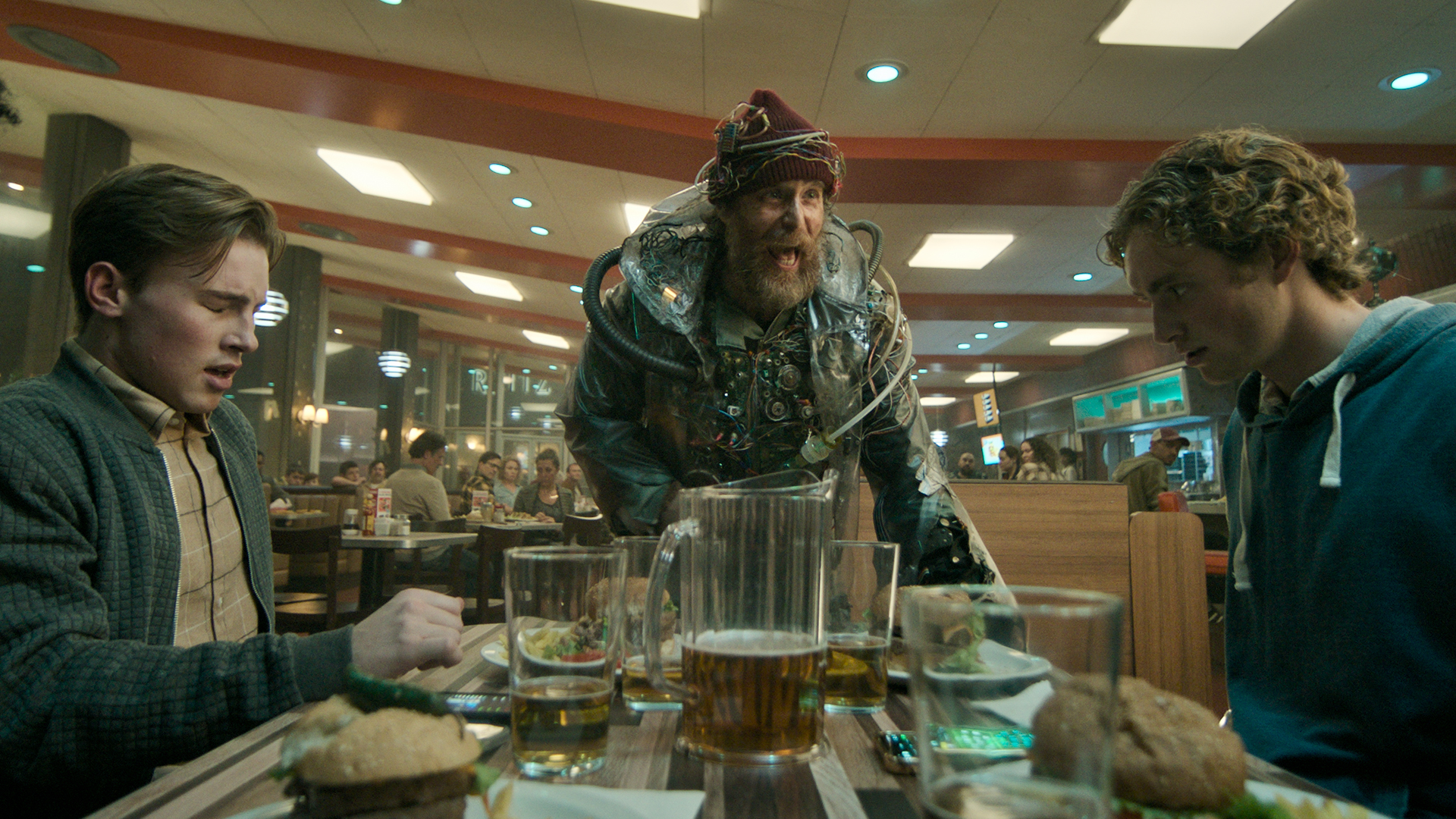 In our present, a man claiming to be from the future (Rockwell) arrives in a diner to recruit people to stop a nine-year-old from inventing an AI that will ruin the planet. The man knows that the customers in this diner, in some combination, are the key to stopping the world-ending operating system, but he doesn’t actually know who he needs to recruit. As patrons reluctantly join his cause, we see glimpses of their backstories and the run-ins they had with tech that tip them off to this man possibly speaking the truth. With allies in tow, this man from the future embarks on a mission to save reality as we know it.